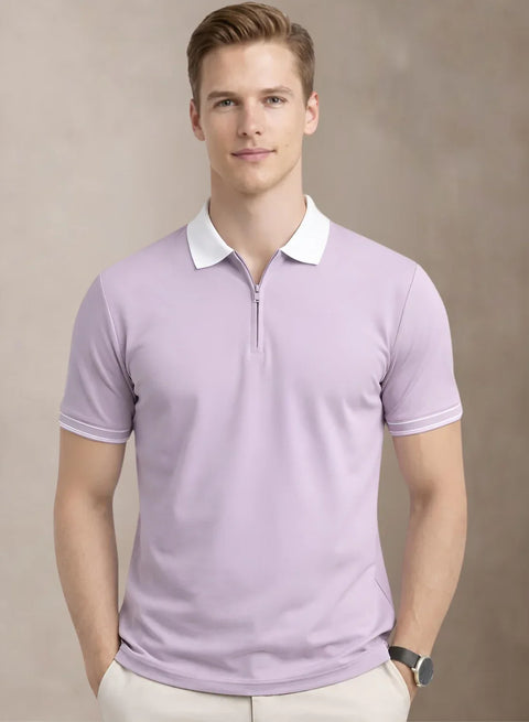 Adro Cotton Polo T Shirt for men | Regular Fit Zipper Polo T-shirt | Short Sleeve Lavender Solid Polo Tshirt with Zip | Soft Fabric for Summer