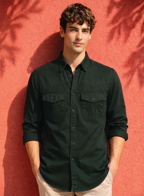 ADRO Mens Green Cotton Casual Shirts – Regular Fit, Dual Flap Pocket, Soft Washed Fabric, Full Sleeve Solid Shirt for Men