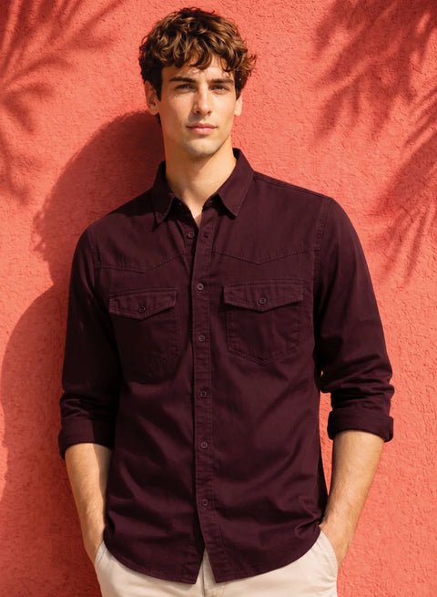 ADRO Mens Maroon Cotton Casual Shirts – Regular Fit, Dual Flap Pocket, Soft Washed Fabric, Full Sleeve Solid Shirt for Men